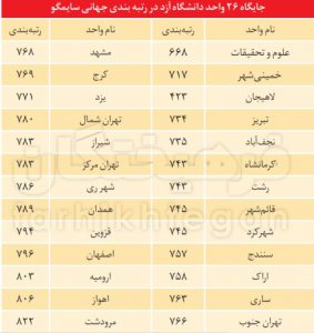 در آخرین ویرایش این رتبه‌بندی سال ۲۰۱۹ سایمگو اقدام به رده‌بندی ۶ هزار و ۴۵۹ دانشگاه و موسسه تحقیقاتی دنیا کرد. در این رده‌بندی سایمگو، ایران با ۱۴۴ دانشگاه برتر در میان این جمع قرار گرفته که در این بین، ۲۶ واحد دانشگاه آزاد اسلامی حضور دارند. دانشگاه آزاد اسلامی واحد علوم‌وتحقیقات در رده ۶۶۸ جهان و ۱۶ ایران قرار گرفته است. در شاخص تحقیقات، واحد علوم و تحقیقات رتبه ۳۷۸ را کسب کرد. این واحد دانشگاه آزاد اسلامی در شاخص ابداعات رتبه ۴۷۷ را از آن خود کرده است. این دانشگاه از منظر پایگاه سایمگو، در شاخص اجتماعی رتبه ۲۱۵ در سال ۲۰۱۹ را کسب کرده است.دومین واحد دانشگاه آزاد اسلامی در این رتبه‌بندی که در رده ۳۷ ایران و ۷۱۷ جهان قرار گرفته، واحد خمینی‌شهر اصفهان است که با رده ۳۷۱ در شاخص تحقیقات، رده ۵۰۵ در شاخص ابداعات و رده ۲۴۳ در شاخص اجتماعی جای گرفته است. این واحد برای اولین‌بار در رتبه‌بندی سایمگو حضور داشته است. سومین واحد دانشگاه آزاد اسلامی، واحد لاهیجان با رتبه ۴۲۳ جهان در سال ۲۰۱۹ در شاخص تحقیقات، سیری صعودی در شاخص ابداعات و کسب رتبه ۴۷۰ در سال ۲۰۱۹ و سیری نزولی نسبت به رتبه ۱۷۵ سال ۲۰۱۸ در شاخص اجتماعی و کسب رده ۲۴۳ سال ۲۰۱۹ به‌طور کلی توانسته رتبه ۷۳۳ جهان و پنجاهم را بین دانشگاه‌های ایران به دست آورد. دانشگاه آزاد اسلامی واحد تبریز چهارمین واحد دانشگاه آزاد اسلامی است که توانسته در رتبه‌بندی سایمگو جای گیرد. این واحد در رتبه ۷۳۴ جهان و ۵۱ ایران قرار دارد.همچنین واحد نجف‌آباد در رده جهانی ۷۳۵ و رتبه ملی ۵۲، واحد کرمانشاه در رده ۷۴۳، رشت در رده ۷۴۳، واحد قائمشهر رتبه ۷۴۵، واحد شهرکرد رتبه ۷۴۵، سنندج رتبه ۷۵۷، واحد اراک رده ۷۵۸، واحد ساری رتبه ۷۶۳، واحد تهران جنوب رتبه ۷۶۶، مشهد رتبه ۷۶۸، کرج رتبه ۷۶۹، یزد رتبه ۷۷۱، واحد تهران شمال رتبه ۷۸۰، شیراز رتبه ۷۸۳، تهران مرکزی رتبه ۷۸۳، شهرری رتبه ۷۸۶، همدان رتبه ۷۸۹، قزوین رتبه ۷۹۴، واحد اصفهان (خوراسگان) رتبه ۷۹۶، ارومیه ۸۰۳، اهواز رتبه ۸۰۶ و واحد مرودشت در رتبه ۸۲۲ قرار گرفته‌اند.