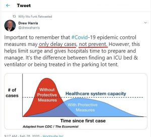 توی این عکس دو تا نمودار میبینید: قرمز نمودار درگیری ۷۰ درصد جامعه است و آبی نمودار درگیری ۴۰ درصد. قرمز زود تمام میشه ولی آبی طول میکشه تا تمام بشه. پس چرا قرمز بدتره؟ بالای عکس توضیح داده که ما میتونیم مبتلا شدن رو به تعویق بندازیم ولی جلوش رو نمیتونیم بگیریم. اگر به تعویق بندازیم فرصت برای ارائه خدمات درمانی فراهممیشه. و با یه توضیح ساده و قشنگ گفته «این یعنی اینکه روی یک تخت icu با تجهیزات کافی درمان بشی یا توی یک چادر بیمارستان صحرایی!»